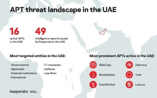 Kaspersky researchers issued 49 threat intelligence reports on investigations associated with APT groups targeting the UAE. The country has the highest number